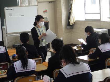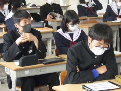 32学級は、音楽の授業の様子です。音楽の教師は、本年度から新しくなりました。少し緊張しながらも、集中して話を聞いていました。
