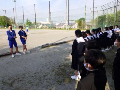 部活動見学では、各部のキャプテンから部活動についての説明がありました。説明後、「何か質問がありますか?」とキャプテンが聞くと「どんな練習を行っているのですか」など、積極的に質問していました。
