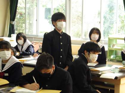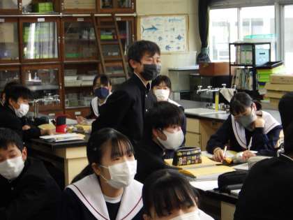 24学級は、理科の「炭酸水素ナトリウムの熱分解」の授業の様子です。実験の結果について、積極的に発言して答えていました。