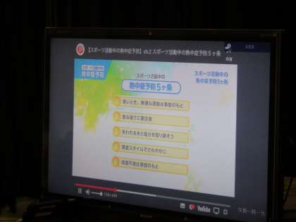 熱中症予防の動画を見ながら、職員全体で熱中症の対策について確認しました。