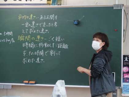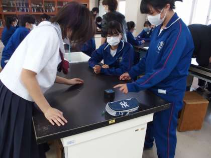32学級は理科室で「運動とエネルギー」の学習を行っていました。運動というのは「速さ」と「方向」で成り立つということを学ぶ学習の導入として、「速さ測定器」を使い、ビー玉が転がる週間の速さを測っていました。