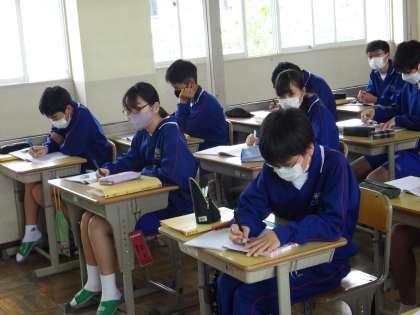 23学級は、理科の「化学変化と原子・分子」の授業の様子です。酸素に関連する化学変化について、教師の説明をノートにまとめながら、理解を深めていました。