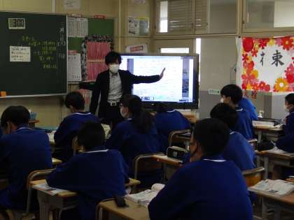 31学級は、社会の「第二次世界大戦の始まり」の授業の様子です。大型テレビに映し出されたヨーロッパの様子から、第二次世界大戦の拡大の広がりを理解していました。