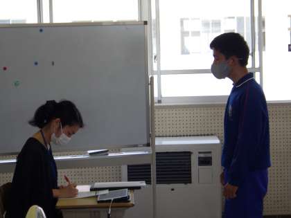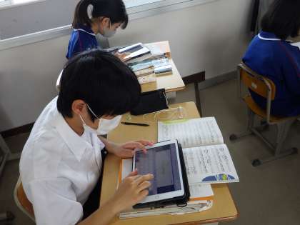 33学級は、音楽の「歌のテスト」の様子です。緊張しながらも、一生懸命歌っていました。歌い終わった後は、今日の自分の歌を振り返り、タブレットに良かった点、改善点を書いていました。