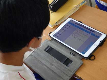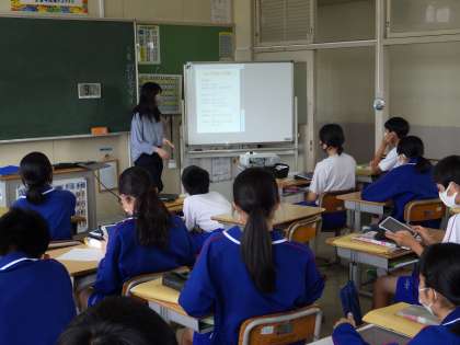 22学級は、理科の「硫黄と結びつく化学変化」の授業の様子です。鉄と硫黄の実験を行い、その結果をタブレットにまとめていました。その実験結果について考察しながら、理解を深めていました。