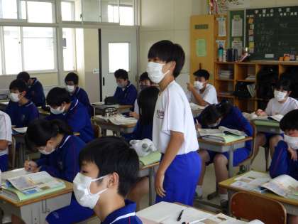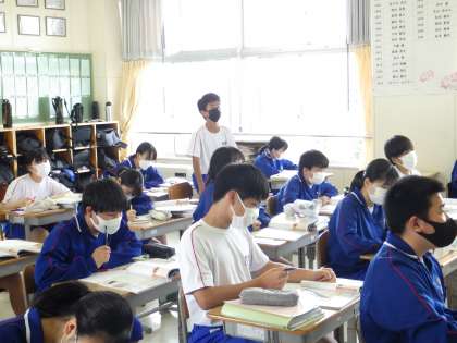 24学級は、社会の「兵農分離と秀吉の対外政策」の授業の様子です。太閤検地について、資料から具体的な内容を読み取り、積極的に発言していました。