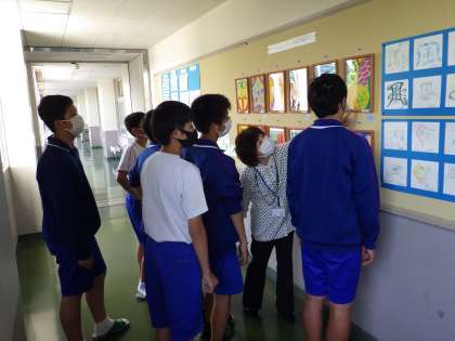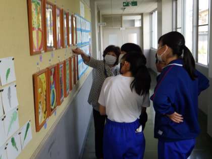 21学級は、美術の「ヤサイ・フルーツをもとにしたデザイン画」の授業の様子です。先輩が描いた過去の作品を見ながら、描くときのポイントなどの確認を行っていました。