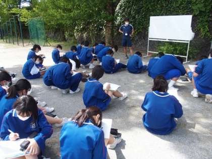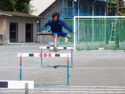 次回行うハードル走の記録会に向け、個人練習を行っていました。ハードル間の距離をいろいろ変えて、自分の歩幅に合うものを探し、いかにスピードを落とさずに走り抜けられるか工夫していました。