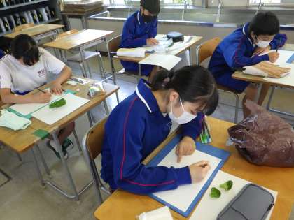 21学級は、美術の「ヤサイ・フルーツをもとにしたデザイン画」の授業の様子です。持ってきた野菜や果物の「切口」を中心に描いていました。