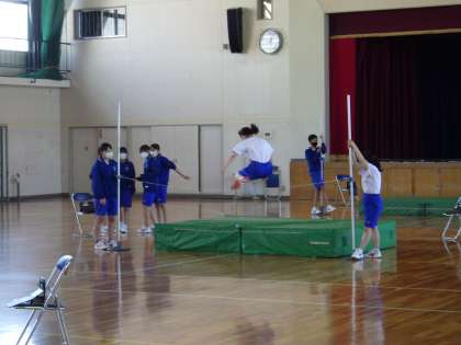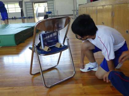 23学級は、体育の「走り高跳び」の授業の様子です。はさみ跳び、ベリーロールの練習を行っていました。跳んだ後、タブレットに映し出された自分の跳び方の映像を見て、「今のは、足のあげ方が低かったな」「跳ぶ位置が近すぎたな」と課題を確認していました。