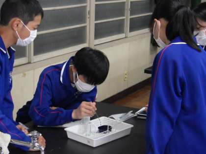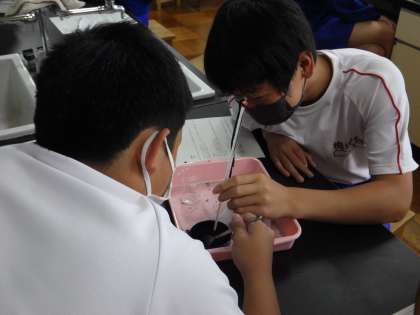 24学級は、理科の「化学変化と熱の出入り」の授業の様子です。化学変化で生じる熱の変化の実験を行っていました。「どんどん温度が上がってきた!」と温度計を見ながら、びっくりしていました。