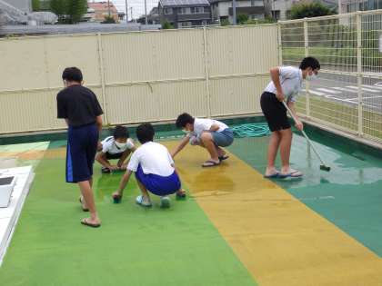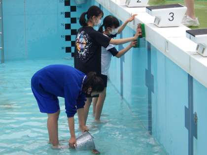 6/16(木) プール清掃の様子です 1 公開日 2022/06/16 更新日 2022/06/16 お知らせ 本日、13学級が体育の時間を使って、プール清掃を行いました。プールの中、プールサイド等、様々な個所の清掃を一生懸命行っていました。 「汚れが取れてきたな」「きれいになると楽しいね」という声が聞こえてきました。昨日は、11学級と12学級がプールの清掃活動を行いました。 1年生の皆さん、清掃活動ありがとうございました。