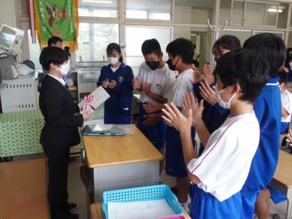 6/17(金)教育実習生お別れ会 公開日 2022/06/17 更新日 2022/06/17 お知らせ 13学級に配属されていた教育実習生のお別れ会が行われました。 最後の思い出作りとして全員でレクリエーションを行い、帰りの会では生徒全員からの寄せ書きがプレゼントされました。 3週間、充実した実習になったと思います。今度は本当の先生になって、生徒の前に立ってくれることを祈っています。