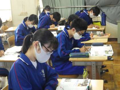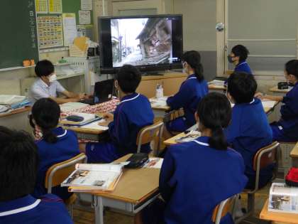 34学級は、社会の「持続可能な社会に向けて」の授業の様子です。阪神・淡路大震災の映像をデジタル教科書で見ながら当時の震災の状況を感じ取っていました。視聴後、ノートに丁寧にまとめ、理解を深めていました。