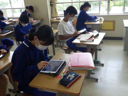 24学級は、国語の「魅力的な提案」の授業の様子です。発表原稿をタブレット使用しながら、作成していました。