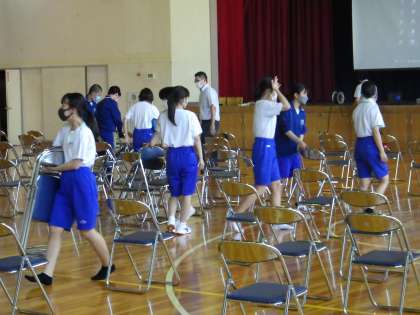 3年生のボランティアが、進路説明会で使用する体育館の準備を行っている様子です。
