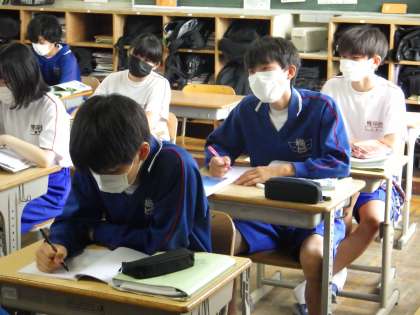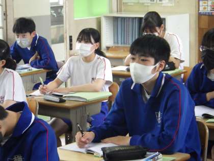 33学級は、理科の「生物の子孫の残し方」の授業の様子です。教師の説明を集中して聞いたり、疑問点があると質問したりと、意欲的に学習に取り組んでいました。