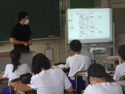 22学級は、技術の「燃料を利用した技術」の授業の様子です。発電所の仕組みについて教師の説明を聞いた後、ノートにまとめながら理解を深めていました。