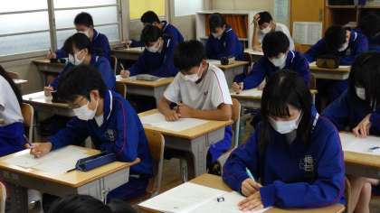 34学級は、英語の授業の様子です。14日(木)に行われる第1回学習診断テストに向けて、対策プリントを行っていました。