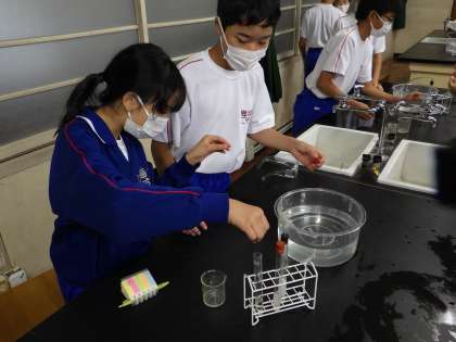 13学級は、理科の「いろいろな物質」の授業の様子です。石灰水にうすい塩酸を加えて、二酸化炭素を発生させ、二酸化炭素の性質を調べる実験を行っていました。発生させた二酸化炭素が入っている試験管に線香を入れ、火が消えていく様子を見て、「消えた!消えた!」と声を上げていました。