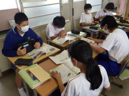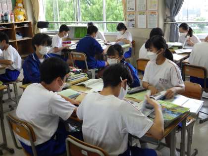 21学級は、社会の「日本の諸地域」の授業の様子です。班で、地域の「産業」「世界とのつながり」等、どの分野を調べていくか話し合って決めていました。