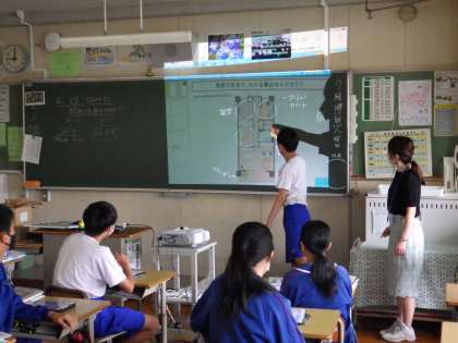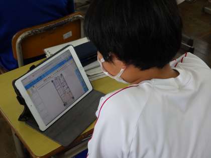 23学級は、家庭科の「持続可能な住生活」の授業の様子です。タブレット画面に表示された部屋の間取りを見て気づいたことを書き込み、発表しながら全体で確認していました。