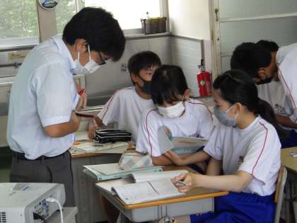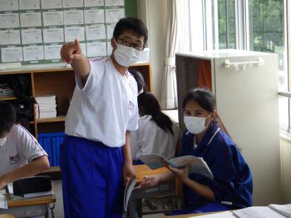 13学級は、数学の「関係を表す式」の授業の様子です。3年生の学習診断テストの問題を級友と相談しながら解いていました。「解けたぞ!」「ちょっとわからないから教えて」「できた!ありがとう」という声が教室の至るところで聞こえてきました。