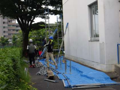 本日は、足場の設置等を行っています。