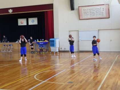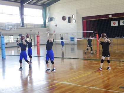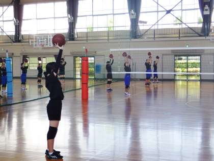 バスケットボールを使って、オーバーハンドパスの形を作っています。