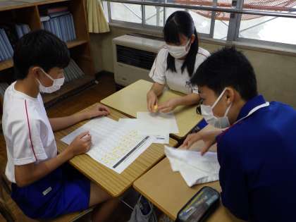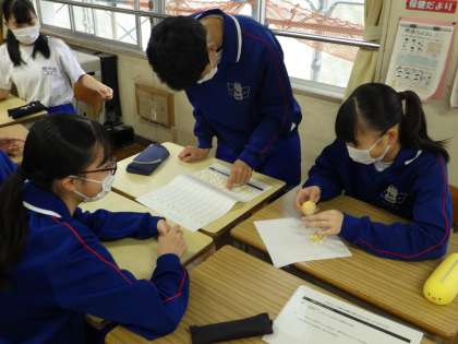 31学級は、理科の「遺伝の規則性と遺伝子」の授業の様子です。グループでとうもろこしの黄色い粒と白い粒を数えながら、遺伝の規則性について考えていました。