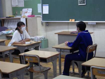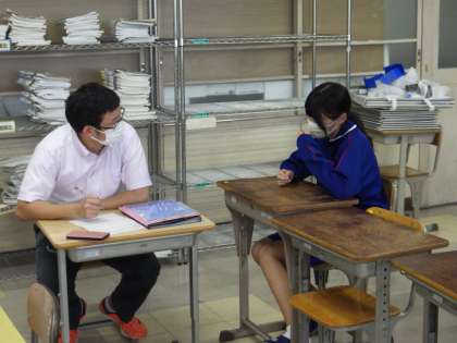 事前に実施した「ふれあいアンケート」をもとに、学習、生活、進路、友人関係、部活動等について、一人一人と面談を行っています。