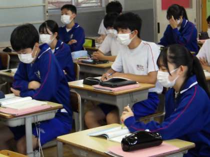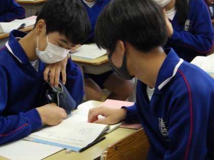 31学級は、国語の「挨拶〜原爆の写真によせて〜」の授業の様子です。詩の文を現在と過去に分けながら、読み取りを行っていました。疑問点があると、級友と相談しながら、確認していました。