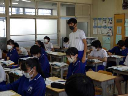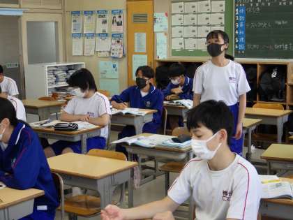 32学級は、体育の保健「環境問題への取り組み」の授業の様子です。積極的に挙手し、重要語句を確認していました。