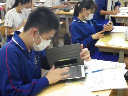 34学級は、英語の授業の様子です。デジタルドリル教材(AI型教材Qubena(キュビナ))を活用して、間接疑問文の問題を解いていました。「Qubena(キュビナ)をやってみてどう?」と聞くと、「Qubena(キュビナ)は、何回も繰り返して行うことができるので、よくわかるようになります」と話してくれました。今後も積極的に活用していき、生徒の知識の定着につなげていきたいと思います。