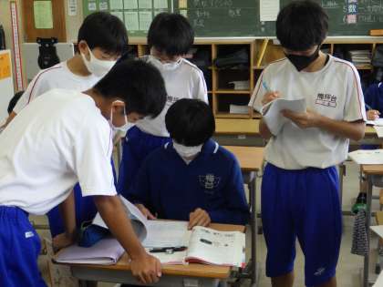 22学級は、英語の「助動詞must」の授業の様子です。mustを使った練習問題の解き方、答えについて、積極的に級友と確認し、理解を深めていました。