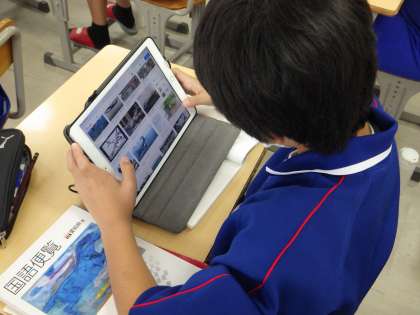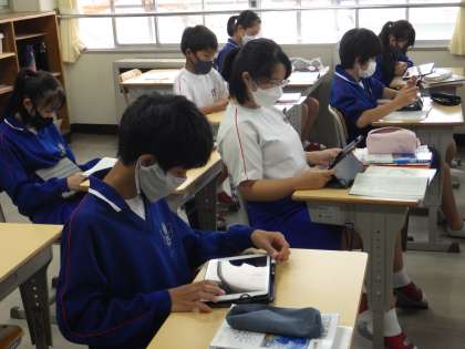 11学級は、国語の「大人になれなかった弟たちに……」の授業の様子です。戦時中の様子を学習用タブレットを使って調べていました。「戦時中はこんな様子だったのか。怖いな」という呟きが聞こえてきました。