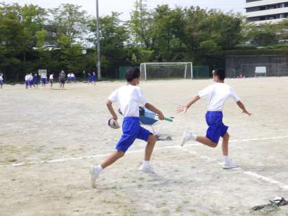 12学級は、体育の「陸上競技リレー」の授業の様子です。「バトンパスがどうすればうまくいくのか」をグループで話し合いながら、繰り返し練習を行っていました。