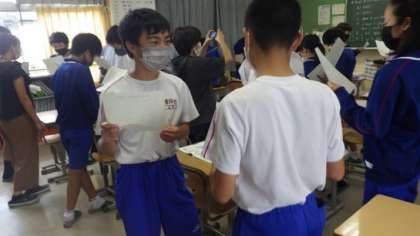 2限に、21学級で英語の研究授業を行いました。「have to」の文型を使って、自分の一週間のスケジュールを伝え合いました。その後、ペアを変えて何度も伝え合うことにより、「have to」の文型の使い方を一人一人が楽しく理解していました。今後も、一人一人が生き生きと活躍できる授業を行っていきたいと思います。