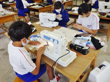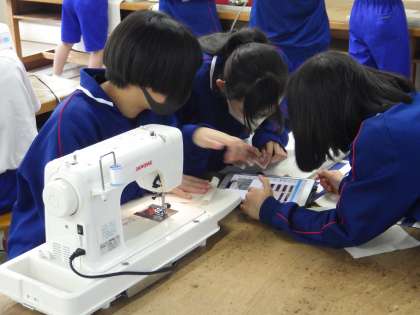 11学級は、家庭科の「バルキーバック製作」の授業の様子です。ポケットの製作に取り組んでいました。疑問点があると、教師に聞いたり、学習用タブレットで確認したりしながら、進めていました。