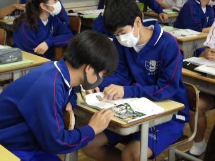31学級は、理科の「生物どうしのつながり」の授業の様子です。生態系について、級友とお互いの考えを聴き合い、確認していました。