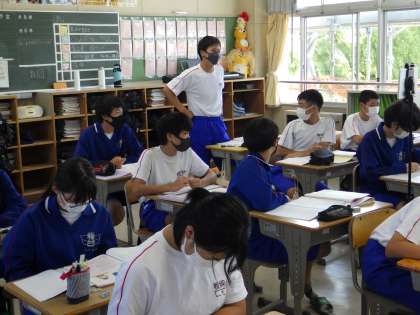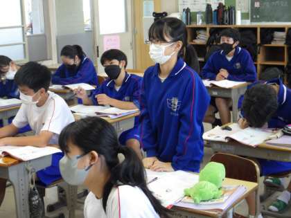 21学級は、英語の「動名詞」の授業の様子です。積極的に挙手し、自分の考えを学級全員に堂々と伝えていました。