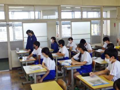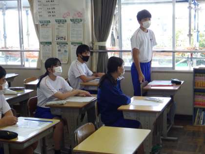 23学級は、学級活動の「合唱コンクールに向けて」の授業の様子です。「どんな合唱コンクールにしたいか」について、学級全員で考えを出し合っていました。「学級の絆を高めたい」「一生思い出に残る合唱コンクールにしたい」など、自分の想いを全員に伝えていました。
