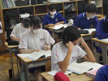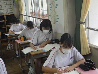 33学級は、国語の「故郷」の授業の様子です。現在のシーンと過去のシーンを本文から抜き出し、ノートにまとめていました。