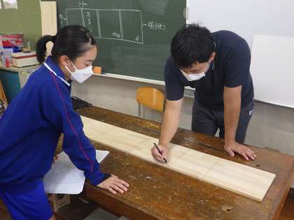 11学級は、技術の「オリジナル木工製作」の授業の様子です。けがき完成を目指して取り組んでいました。疑問点があると、教師に聞き確認していました。
