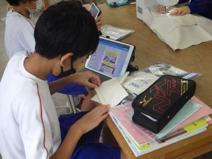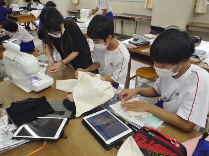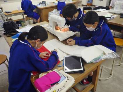 12学級は、家庭科の「バルキーバック製作」の授業の様子です。学習課題は「ポケットを本体に付ける」です。学習用タブレットで製作手順を確認したり、教師に疑問点を質問したりしながら、一生懸命製作していました。