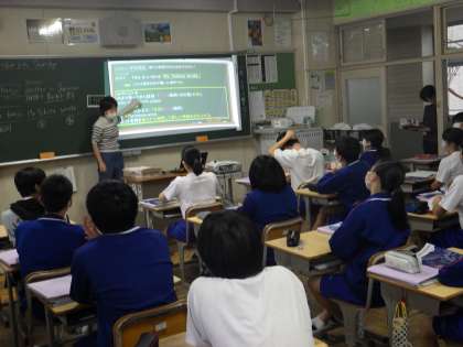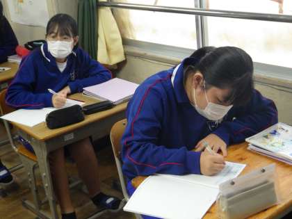 33学級は、英語の「名詞を修飾する文」の授業の様子です。学習ポイントをノートにまとめた後、練習問題を解きながら理解を深めていました。