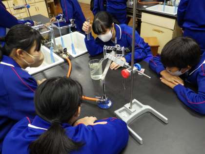 11学級は、理科の「物質の状態変化」の授業の様子です。蒸留の学習で「みりんからエタノールを取り出すことができるのか」を実験で検証していました。