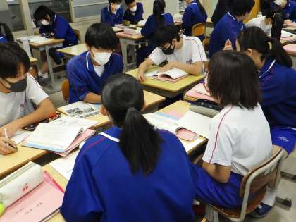 32学級は、国語の「故郷」の授業の様子です。登場人物の行動について、班で話し合っていました。「どうしてそう思ったの?その根拠は教科書のどの部分?」という声か聞こえてくるなど、白熱した話し合いが行われていました。