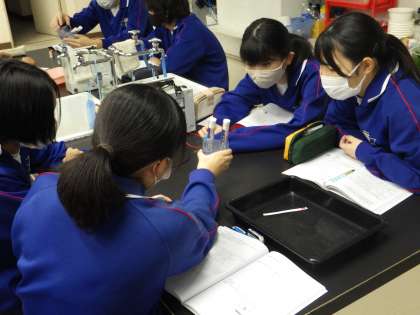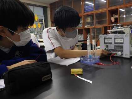 33学級は、理科の「水溶液とイオン」の授業の様子です。学習課題「塩酸に電流が流れているとき水溶液中では何が起きているのか」を確かめるための実験を行い、記録をノートにまとめながら検証していました。