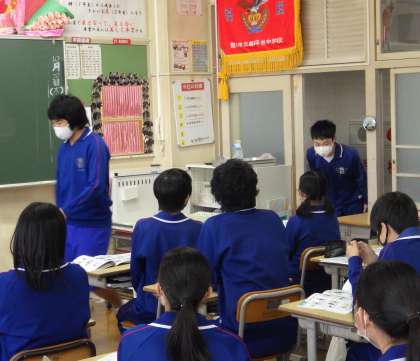 31学級は、学級活動の「面接の行い方」の授業の様子です。あと、数か月経つと、いよいよ入試が始まります。それに向けて、部屋の入り方や座り方について確認していました。また、面接の際に聞かれやすい項目について、何と答えればいいのか考えていました。